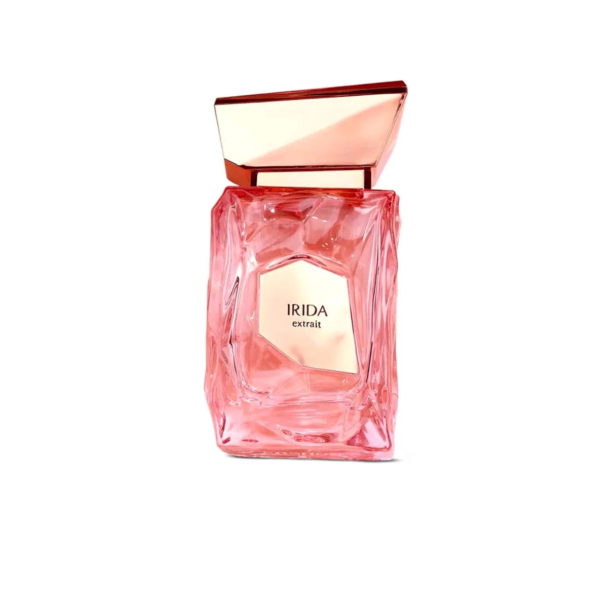 Về thiết kế, chai Irida Extrait mang phong cách sang trọng, tinh giản đặc trưng của French Avenue: thân chai thủy tinh trong suốt phô bày chất nước màu hồng đỏ ánh đào gợi cảm hứng từ sắc cherry ngọt ngào trong hương thơm. Nắp bạc sáng bóng tạo điểm nhấn thanh lịch, còn tổng thể hình khối vuông vắn thể hiện sự mạnh mẽ xen lẫn nữ tính.