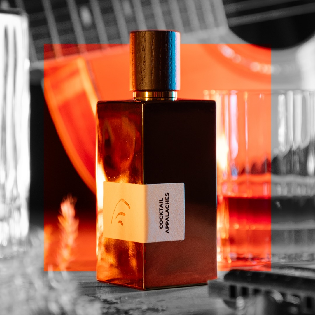 Chai nước hoa này lấy cảm hứng từ những buổi tiệc âm nhạc bên dãy núi Appalaches, nơi tiếng guitar vang lên trong cái lạnh buổi tối, hòa cùng mùi rượu mạnh và lửa trại len vào không khí. Vì vậy, ngay từ tầng hương mở đầu, người ta đã cảm nhận được một sắc thái “boozy” rất rõ: một nốt rượu gỗ liquor accord vừa nồng, vừa ấm, như một cú chạm đầu tiên đầy táo bạo và gợi cảm. Khi mùi mở dần, tầng giữa bung ra sự quyến rũ đặc trưng với amaretto ngọt nhẹ, chút vừng rang ấm béo, tiêu hồng thoang thoảng tạo độ cay tinh tế, và đặc biệt là sự hòa trộn mềm mại giữa thuốc lá ấm và vani thơm ngọt. Tổng thể mang đến một cảm giác vừa mượt mà, vừa hun hút, vừa có chút nổi loạn rất nghệ. Nốt hương nền của Cocktail Appalaches giữ lại tất cả nét sâu thẳm đó bằng sự hiện diện của benzoin ngọt, khói, nhựa cùng những tone gỗ âm trầm như tiếng đàn vang xa trong màn đêm. Sự hòa quyện này tạo nên độ lưu hương bền bỉ, hơi khói, hơi ấm, có chiều sâu và mang năng lượng rất “đêm”, rất “nghệ sĩ”.